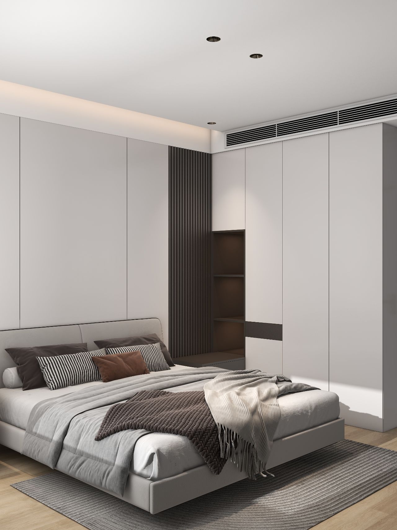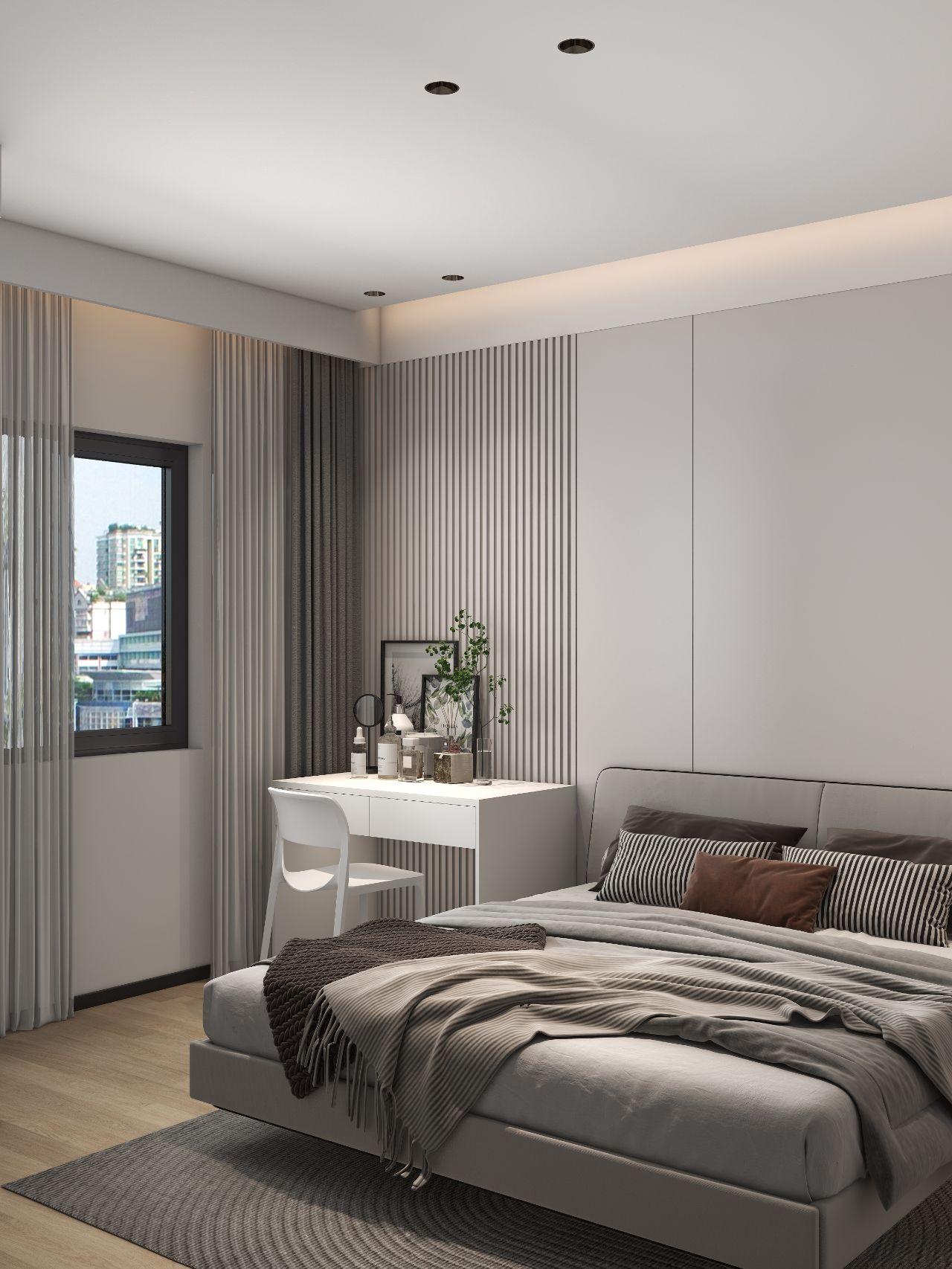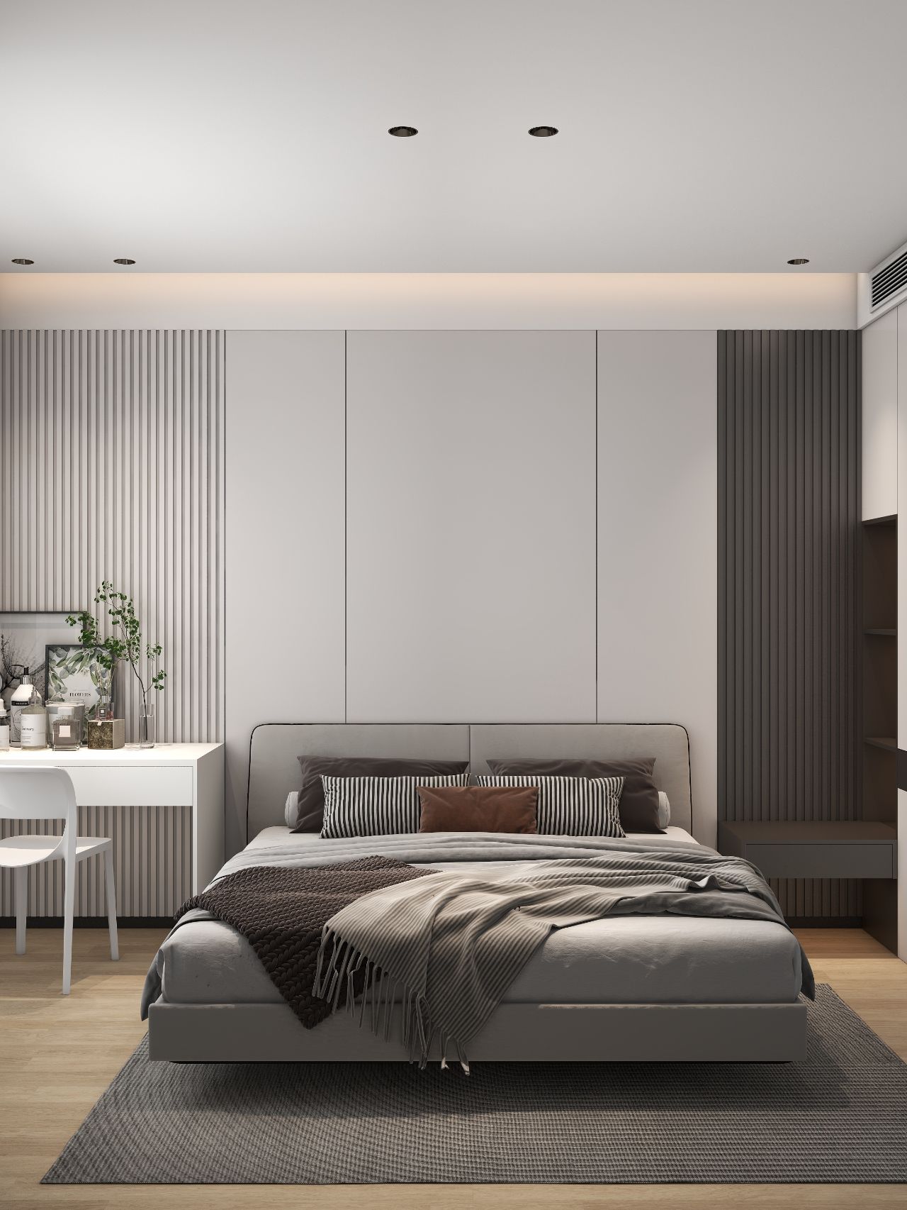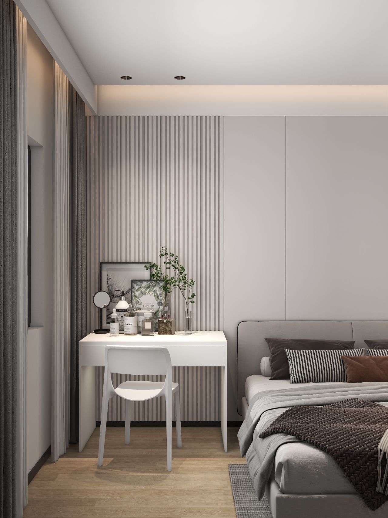 護(hù)墻板床頭背景墻,左邊床頭柜改梳妝臺(tái),無(wú)主燈設(shè)計(jì),實(shí)用又高級(jí)。