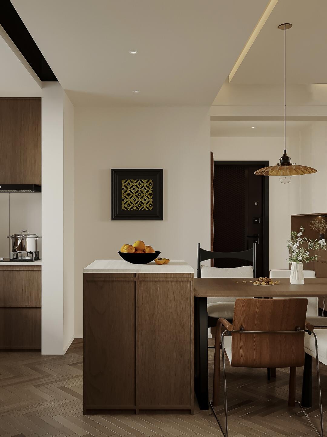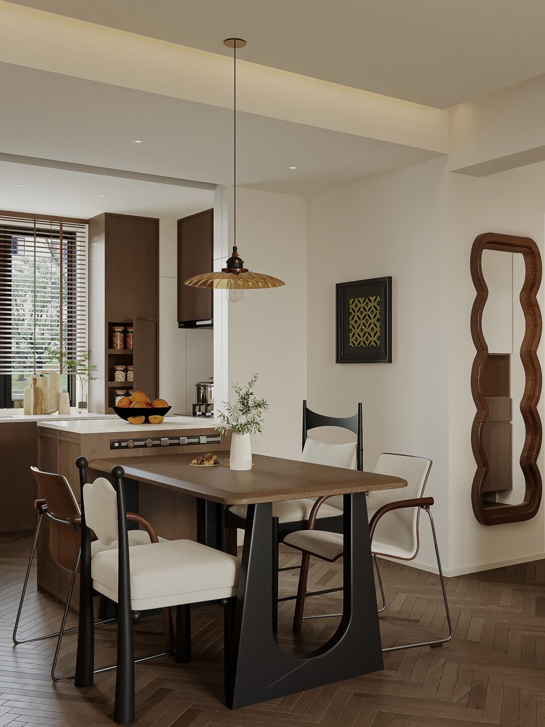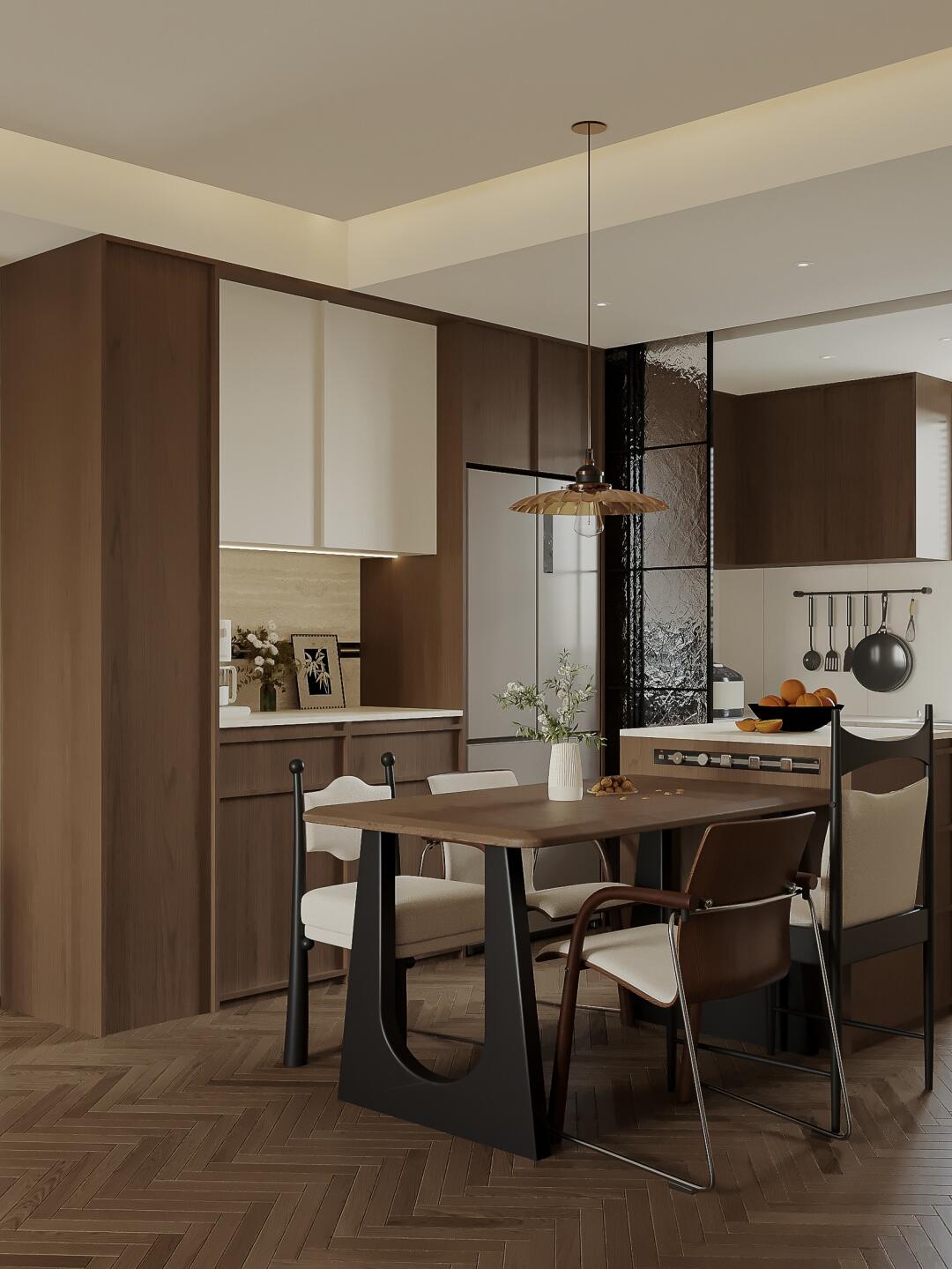 餐廳復(fù)古胡桃木色+黑色,配以淺色柔和藝術(shù)漆,視覺舒適度up?。?!中古氛圍感滿滿~