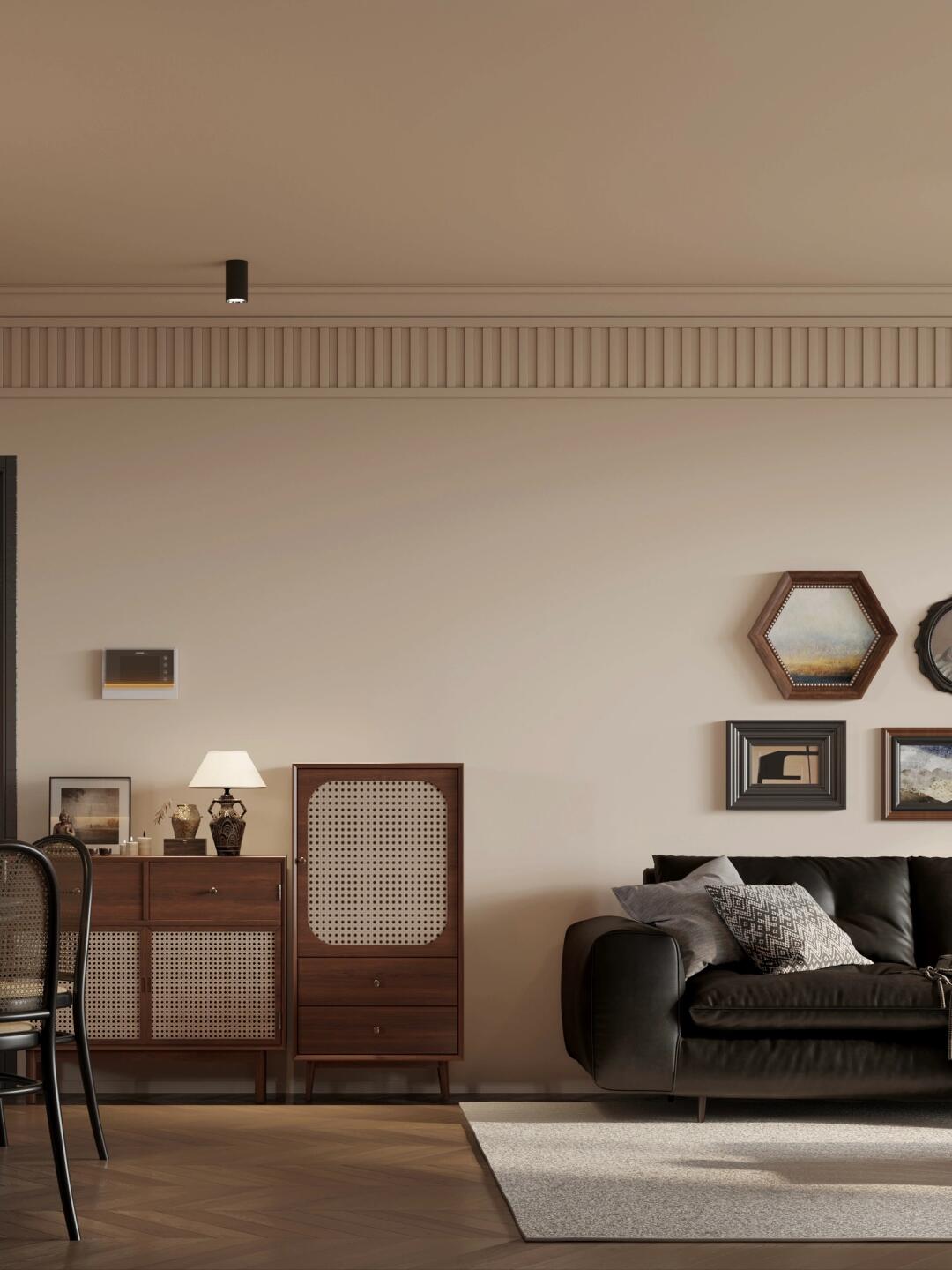全屋通鋪魚骨紋木紋磚和咖色系墻面搭配,奠定了整個空間的基調(diào)。