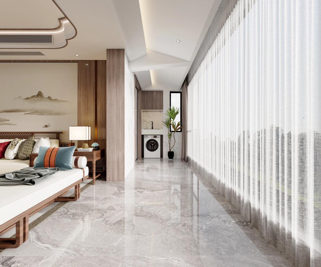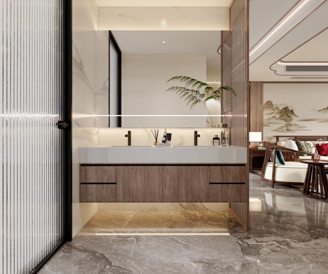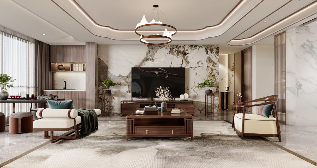 空間整體由大理石和原木組成,沙發(fā)墻選擇水墨畫做背景,色調(diào)溫潤細膩,不失質(zhì)感,
