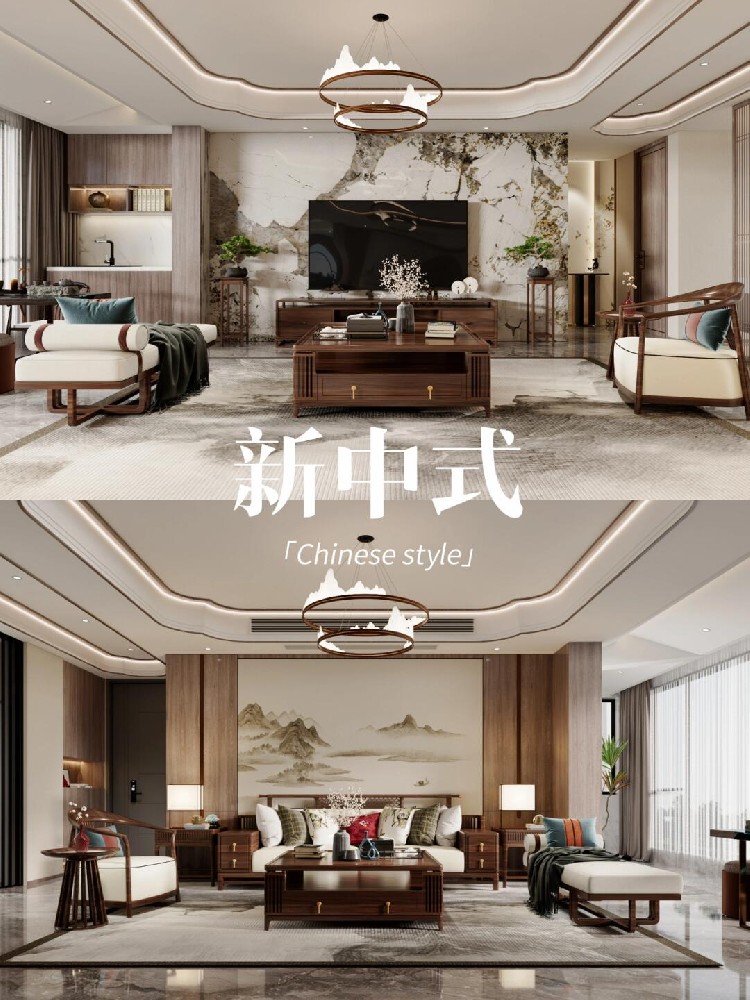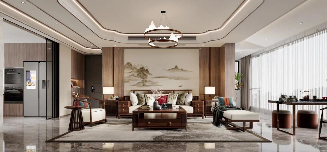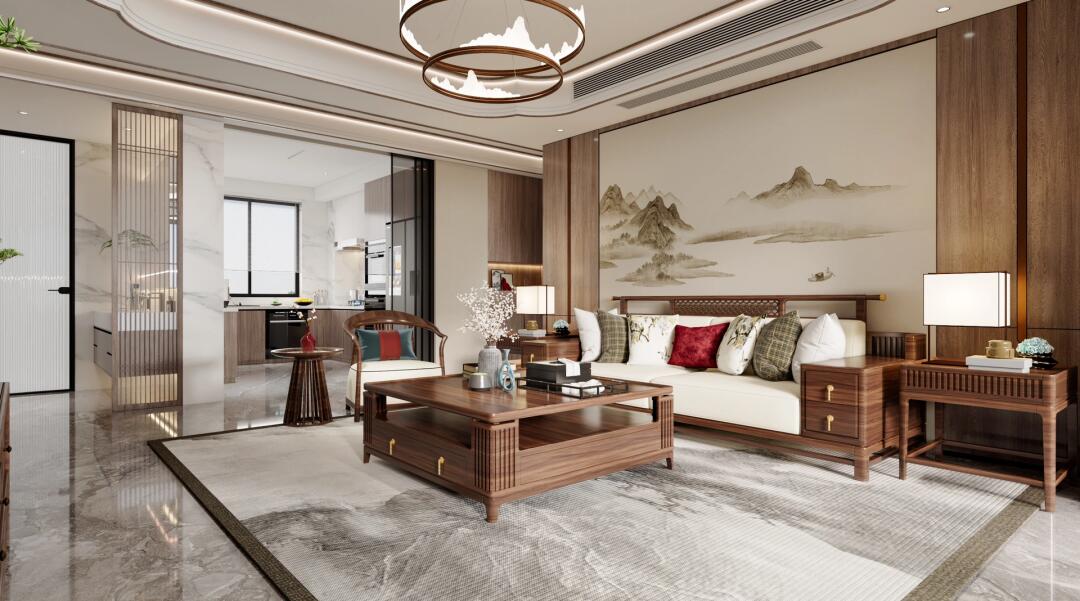 吊燈造型呼應(yīng)山水形狀,中式格調(diào)躍然而出,