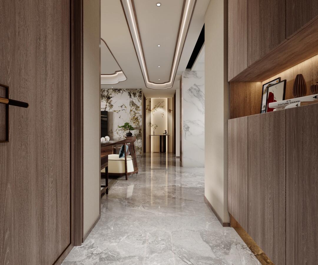 玄關(guān)裝飾以詩入境,挖掘“巧”與“精”的絕妙之處,特意設(shè)計的一面玄關(guān)墻,大理石與木不同材質(zhì)的碰撞,簡,卻余韻十足。