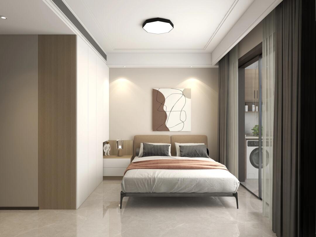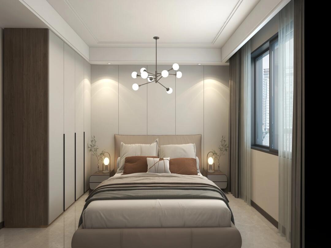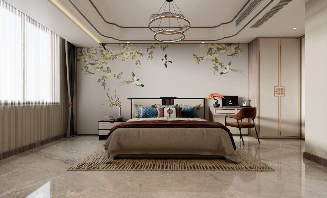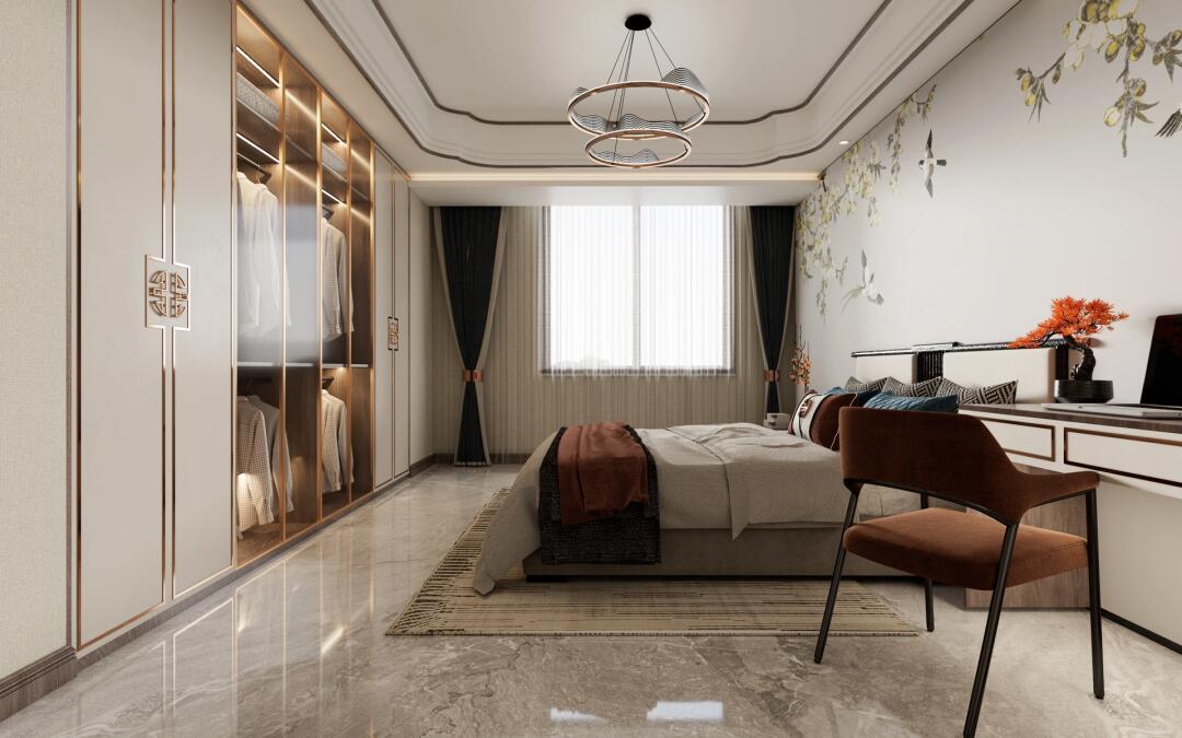 中式簡約相融合,和諧自然,金屬風(fēng)與客廳相似的吊燈,為主臥增添樂趣,氣氛怡然自得。