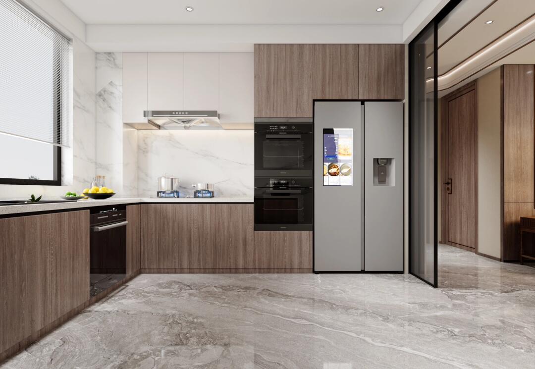 開放式廚房,與客廳相連,整體空間通透連貫,講究一氣貫注。白色大理石與木色收納柜配套,干凈不失大氣。