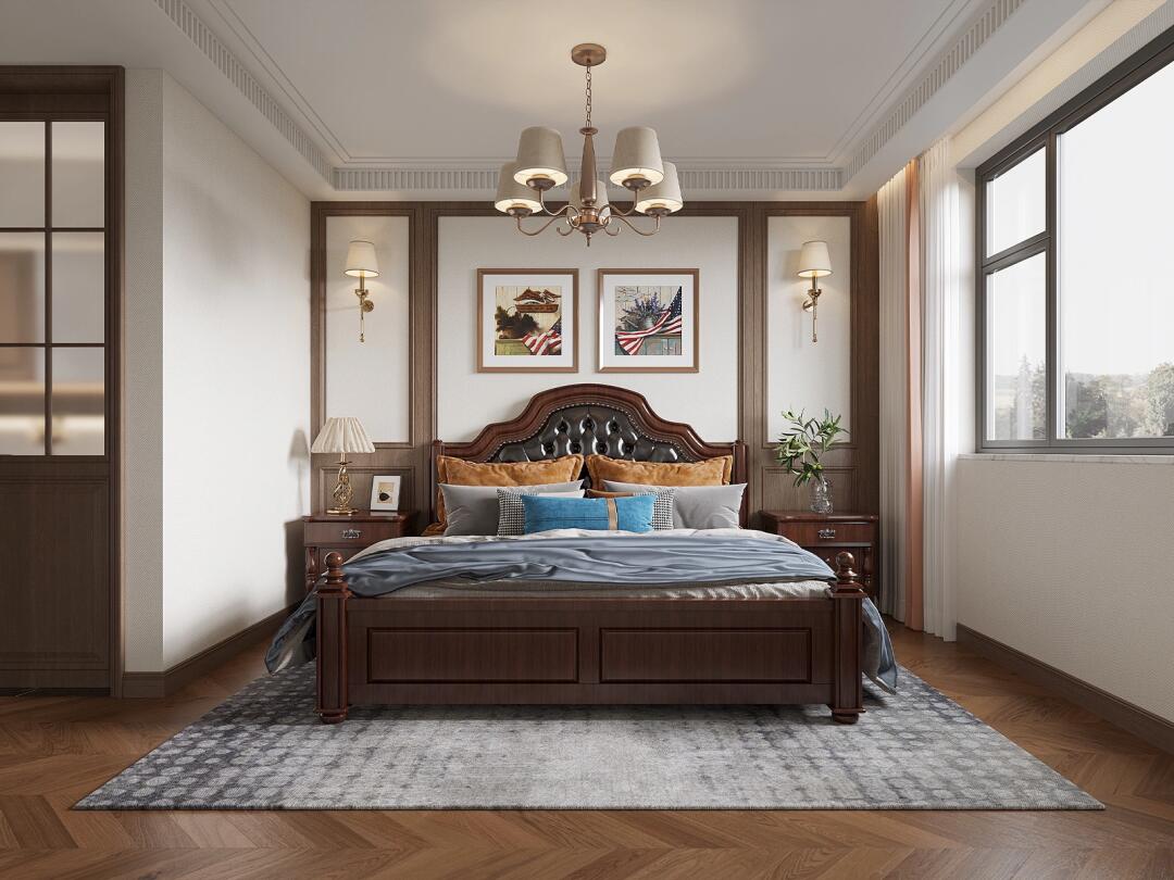 主臥遵循古典美式的獨(dú)特韻味,深咖色墻板自帶高級(jí)復(fù)古感,