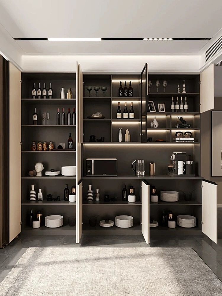 ?收納高柜、玻璃柜、薄吊柜、置物等的多功能設(shè)計(jì),分區(qū)功能更實(shí)用、有藏有露更高級(jí)