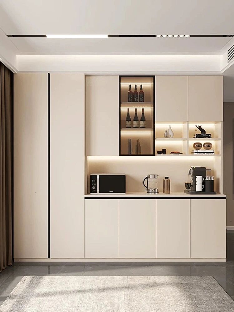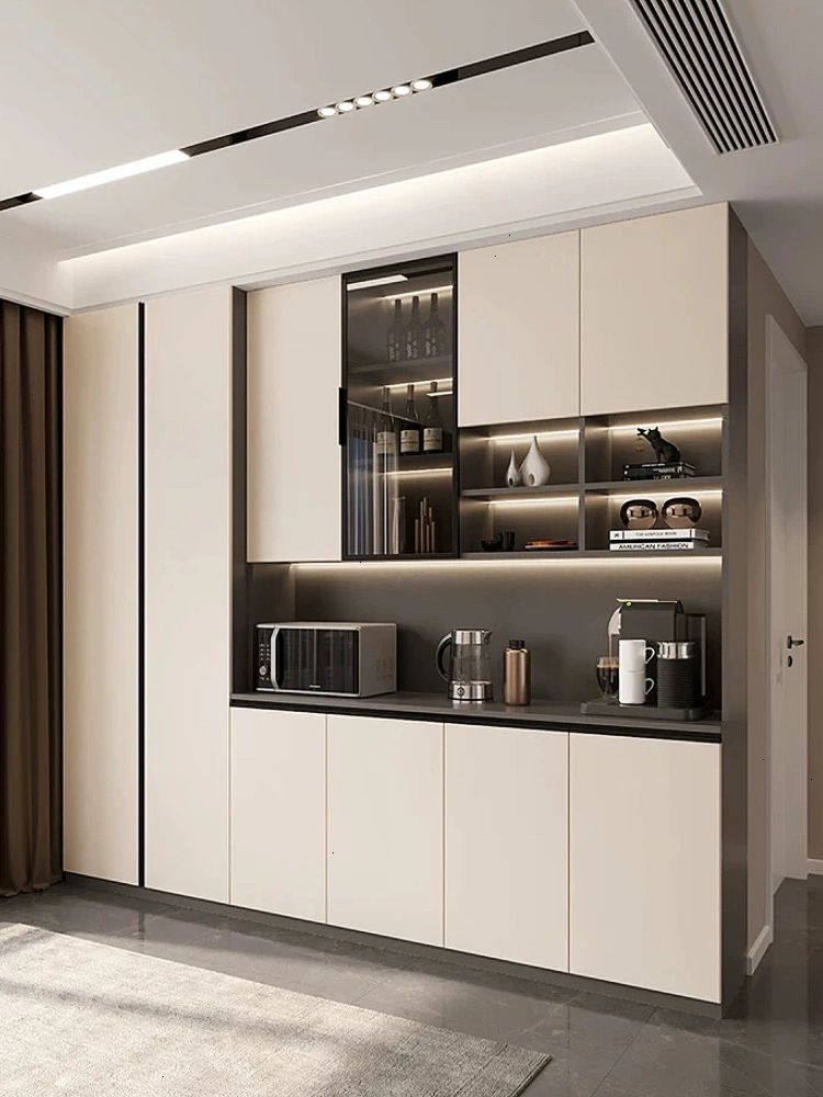 ?餐邊柜做極簡(jiǎn)造型,一體成型的隱形設(shè)計(jì)再搭配上嵌入式燈帶,時(shí)尚且高級(jí)