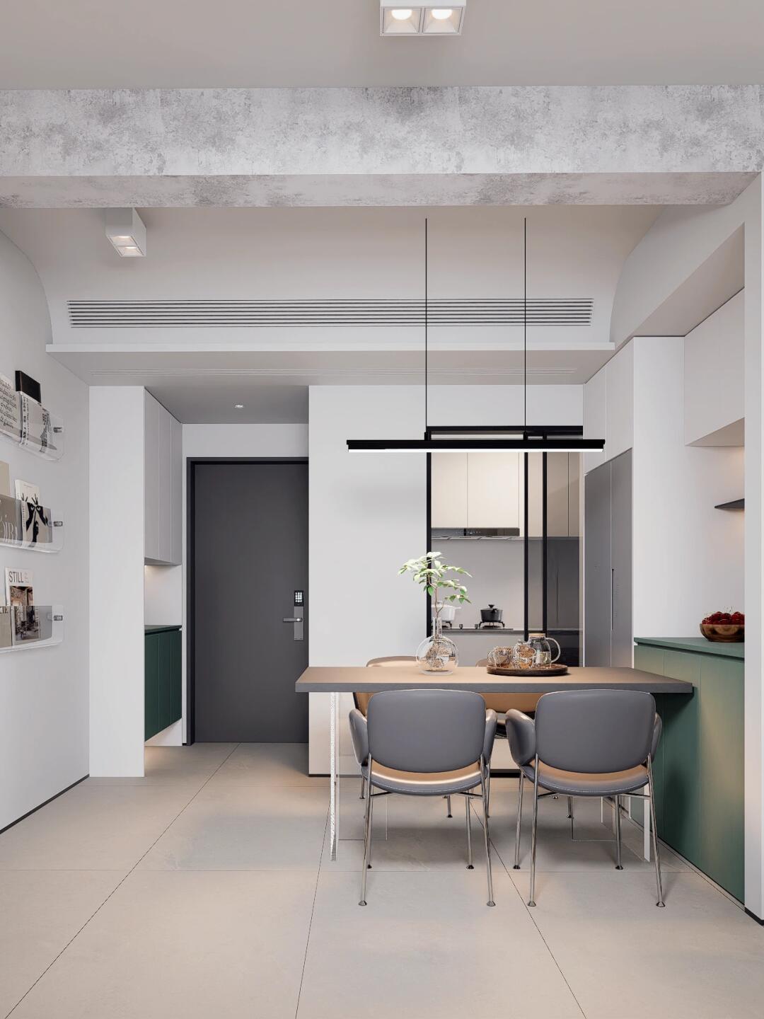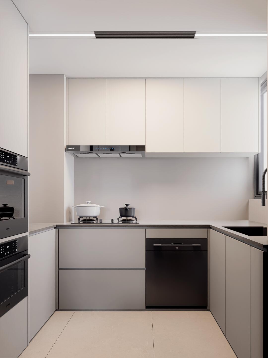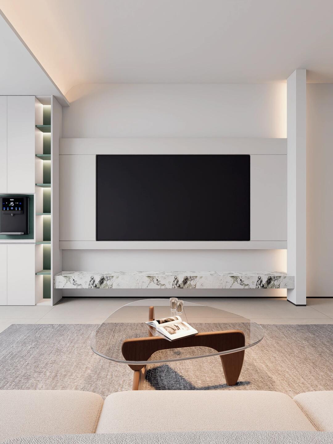 客廳的地面選擇暖灰素色磚,墻面刷上菱花白乳膠漆,天花與墻頂同色,