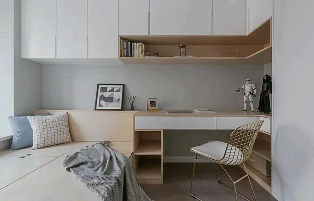 可以將衣柜與書柜一體化設(shè)計,書桌空間往上延伸可利用隔板解決零碎物品的收納和陳列問題。