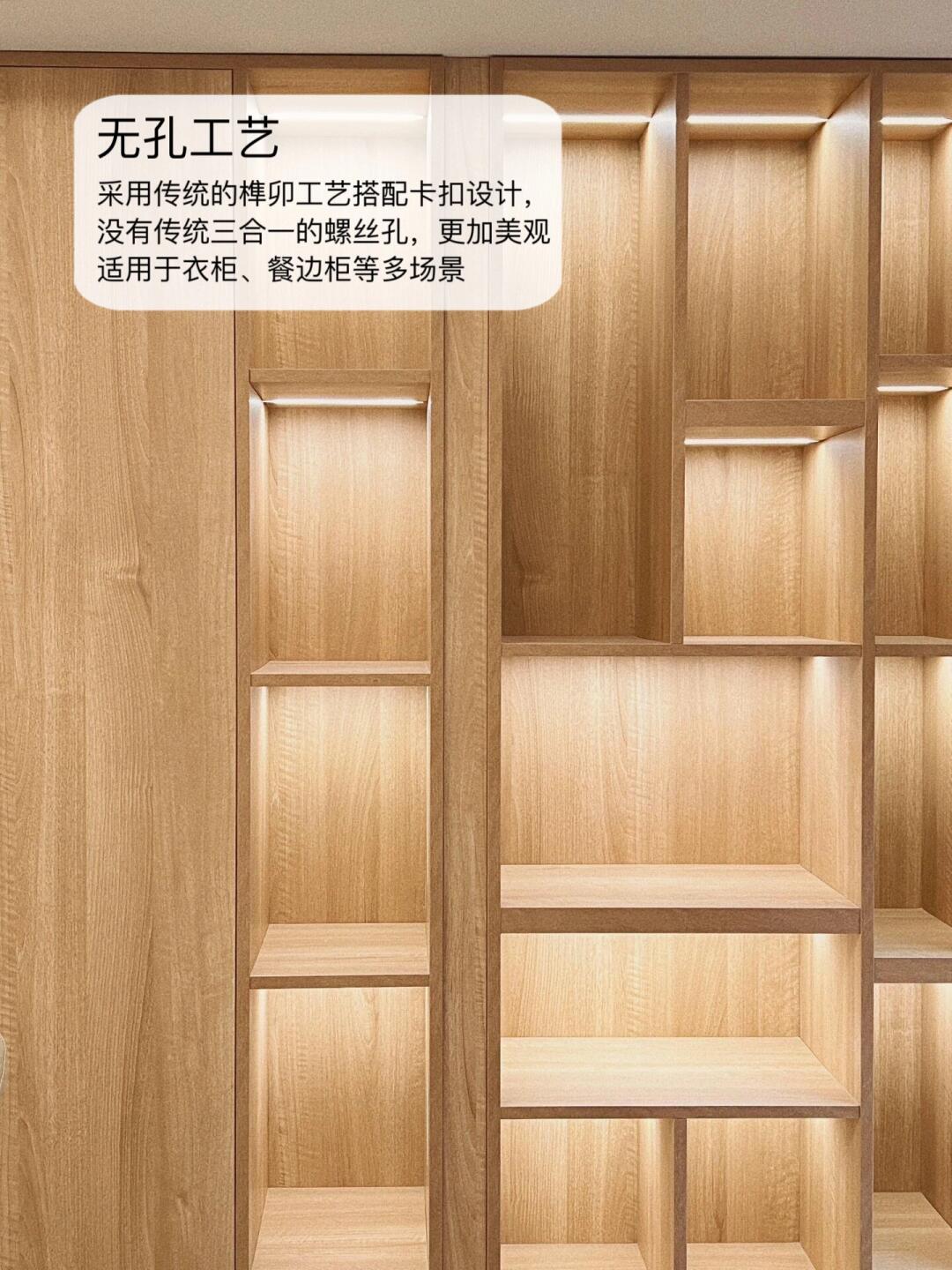 采用傳統(tǒng)榫卯工藝搭配卡扣設(shè)計,沒有傳統(tǒng)三合一螺絲孔,更加美觀、方便清潔,適用于衣柜、餐邊柜等多種場景。