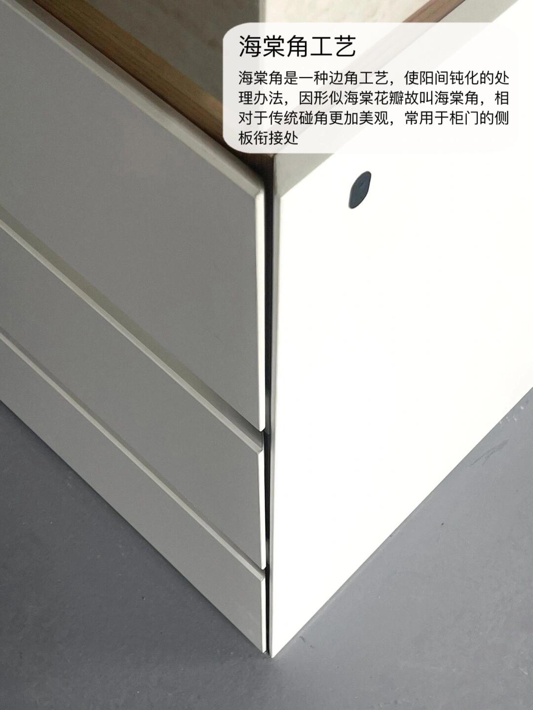 海棠角是一種邊角工藝,是指在建筑裝飾或家具制作中,一種使陽角鈍化的處理辦法,因其形似海棠花瓣故叫海棠角,相對于傳統(tǒng)碰角,海棠角更加美觀,立體感強,常用于柜子的抽面和側(cè)板銜接,柜門的側(cè)板的銜接處。