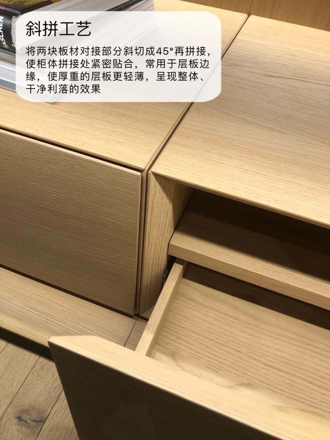 ??斜拼工藝 將兩塊板材對接部分斜切成45度再拼接,使柜體拼接處緊密貼合,常用于層板邊緣,使厚重的層板顯得更為輕薄,呈現(xiàn)整體流暢、干凈利落的效果。