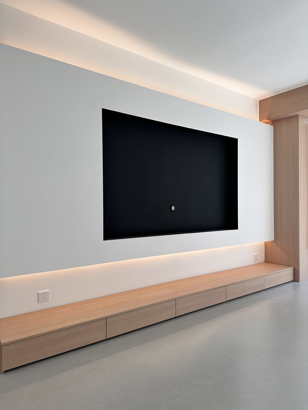 客廳使用懸浮吊頂加洗墻燈帶,其它房間使用10mm陰影縫型材吊頂,這樣整個(gè)天花從墻面剝離,在視覺(jué)上產(chǎn)生懸浮感,還可以防止天花和墻面之間容易產(chǎn)生裂紋的問(wèn)題
