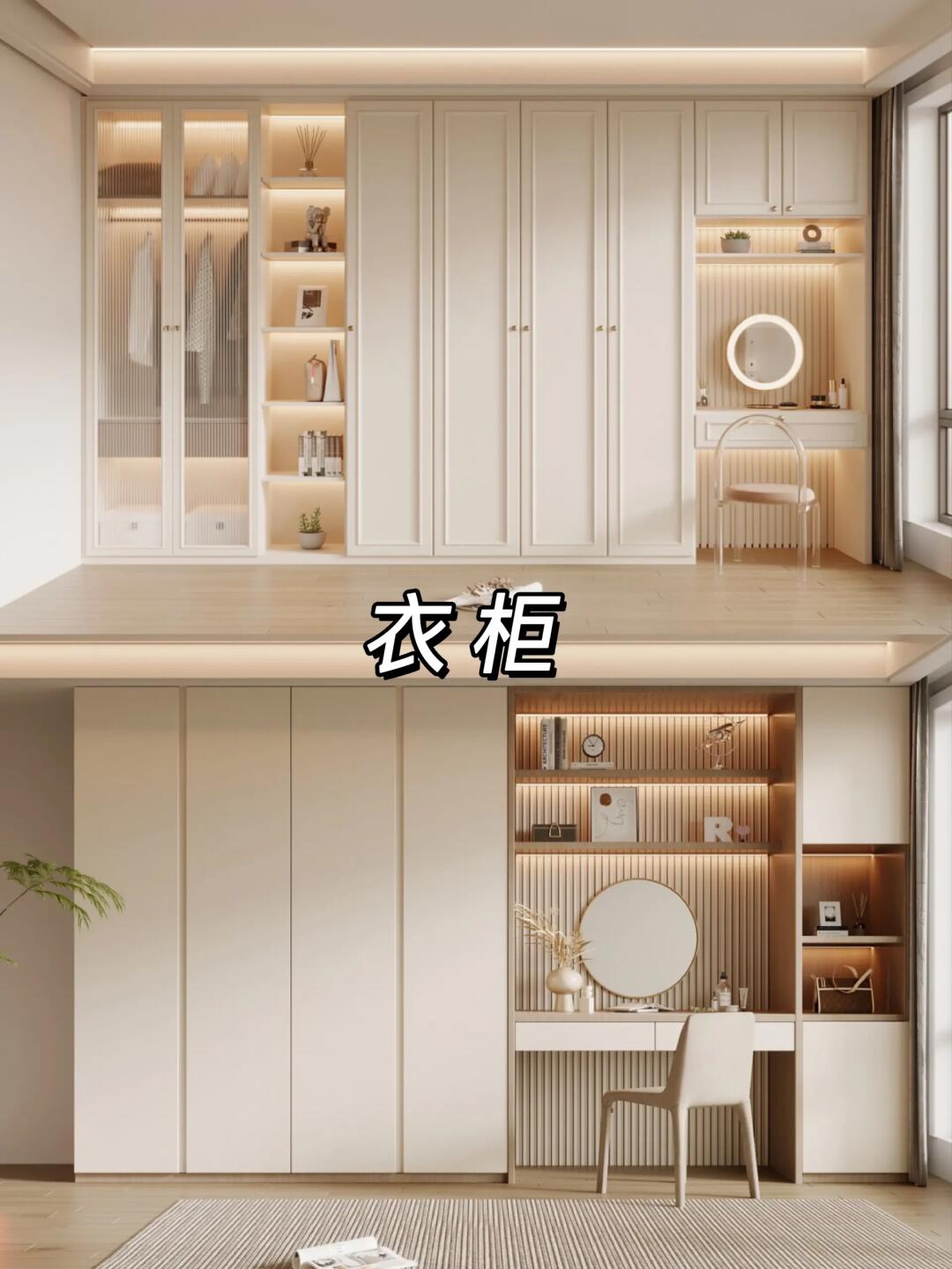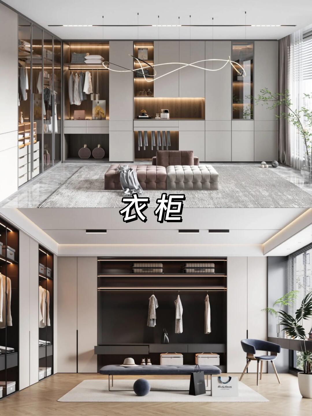 衣柜內(nèi)部可多做掛衣區(qū),柜門做上下分隔式設(shè)計(jì),利用短衣區(qū)掛褲子,貼身衣物。讓空間更加通透明亮。右側(cè)做一排開放格,滿足收納空間。