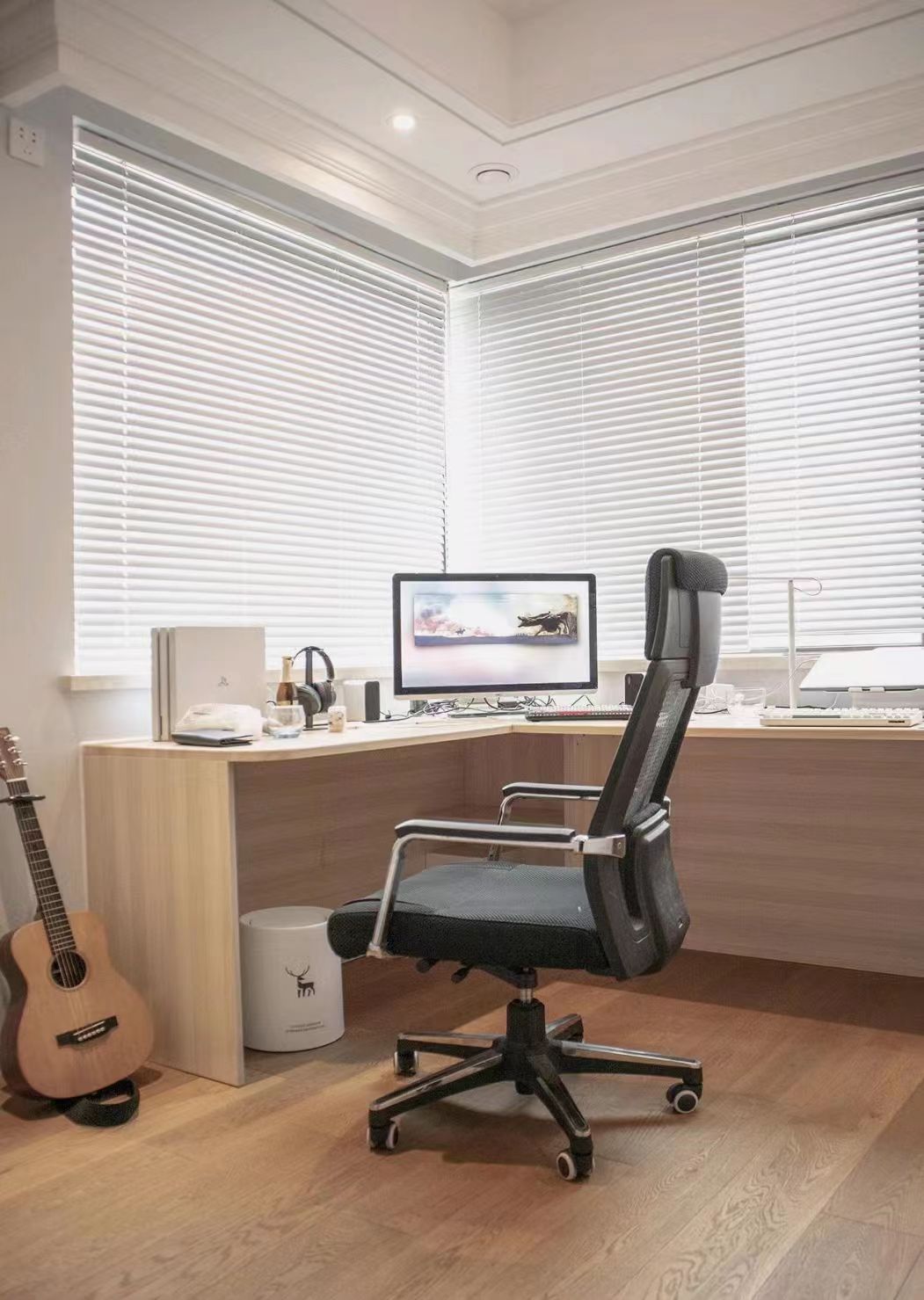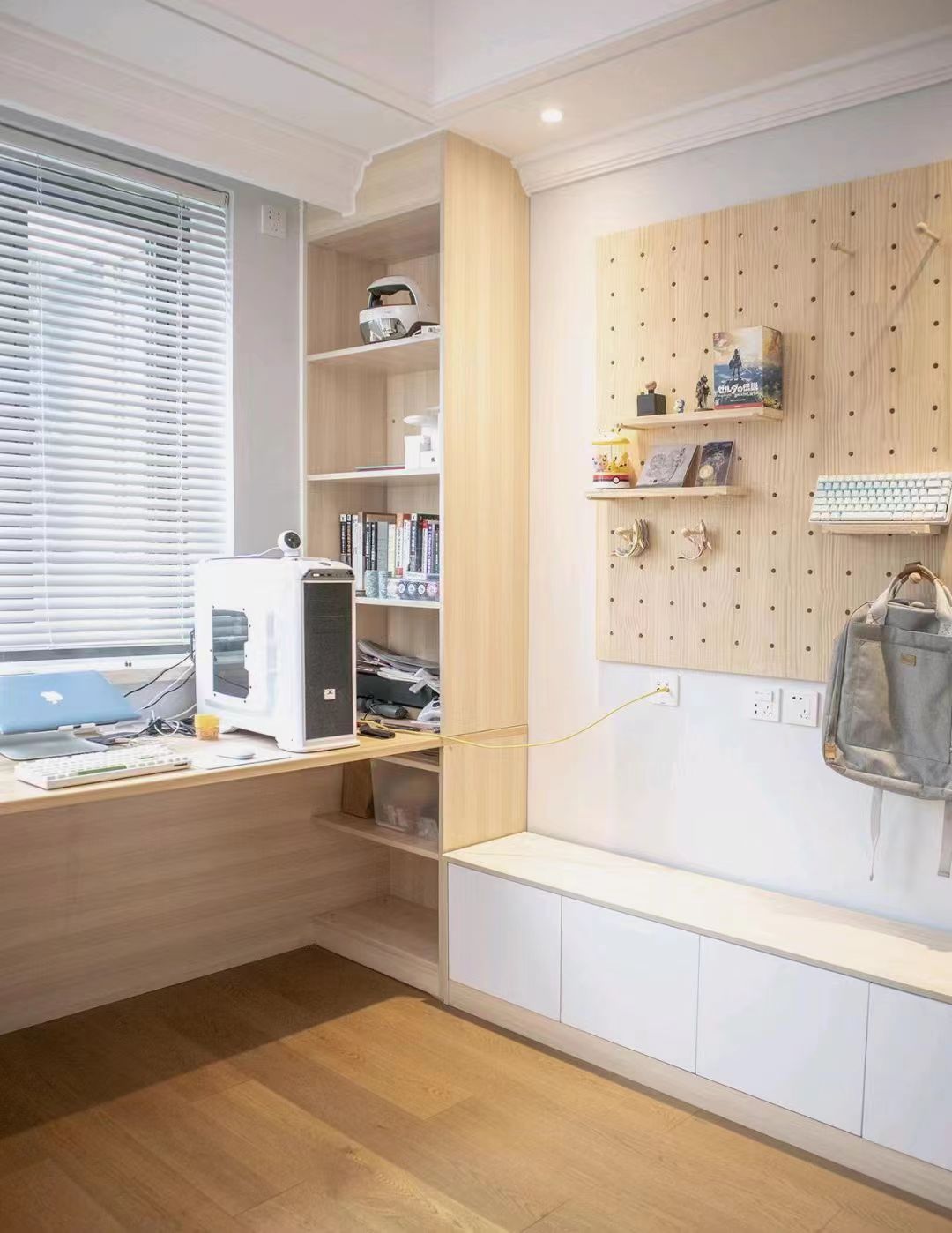 考慮到家中有小朋友,再結合自己的喜好,用書柜和書房的形式,為自己做了一個小清新的書房。